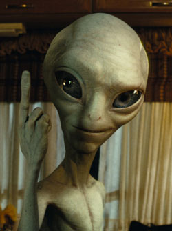 Pegg and Frost simply geek out with references to a whole number of sci-fi classics, like one great big homage for the genre’s fans everywhere, but without going overboard and way over the heads of those just wanting a bit of light entertain. They even bring on board Alien Queen, Sigourney Weaver, as the Federal boss lady (a voice off-camera until the end), who sadly gives up her iconic line, “Get away from her, you bitch”, to another character in the film. That said the lads’ rapport is not quite on a par with their previous hits, Shaun of the Dead and Hot Fuzz that nicely bat the quips back and forth with a healthy doss of irony, and the result is watery imitation with this film. But the addition of Rogen as Paul certainly makes up for a comical and enjoyable threesome that deflects attention away from the pair’s less-than-risqué, better-keep-the-studio-happy gags.